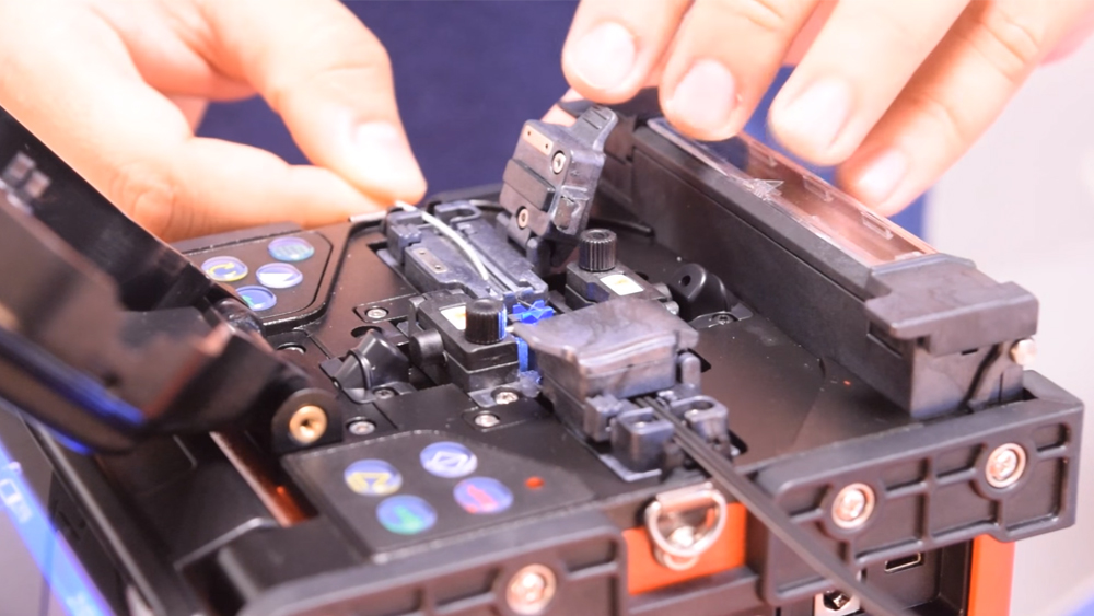 A máquina de fusão de fibra óptica é o dispositivo usado para realizar o processo de junção dos segmentos de fibra. Para isso, eles devem ser introduzidos limpos e clivados (processo que corta a ponta da fibra, realizando um pequeno risco em sua casca para em seguida tracioná-la) no equipamento, com um alinhamento apropriado.