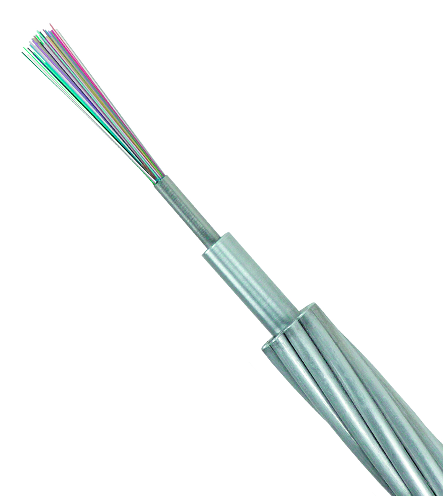 - OPGW (Optical Ground Wire): não poderia deixar de falar sobre este cabo. Para transmissões em longas distâncias, com capacidade elevada de comunicação de dados, usado como para-raios nas linhas de transmissão de energia interligando cidades, estados e países este cabo é constituído em alumínio com o seu centro preenchido com fibras ópticas. Estes cabos são instalados no ponto mais alto das torres de transmissão, veja o exemplo abaixo:
