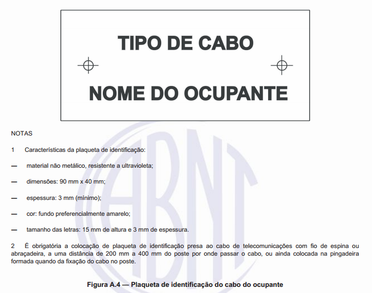 O cabo de telecomunicações deve ter identificação legível, por meio de plaqueta contendo o tipo de cabo, nome do ocupante e telefone para contato, conforme mostrado na Figura 3 (A.4 da NBR 15.214), a distância de fixação da plaqueta no cabo poderá variar entre 0,2 e 0,4 metros. A identificação deve ser instalada em todos os postes, em caixas subterrâneas e também no cabo próximo ao conjunto de emenda óptica – CEO.