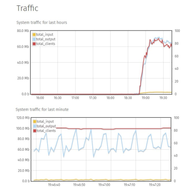Em uma primeira transmissão com divulgação controlada, foram analisados os recursos de consumo de CPU, memória e IO do servidor de streaming. Em termos de tráfego, as cerca de 80 pessoas que acompanharam uma missa ao vivo geraram um fluxo médio de 70 Mbps. Grande parte deste fluxo foi entregue diretamente aos próprios clientes do provedor, e portanto não consumiram recursos de download do backbone de entrada. E a todos os demais clientes externos, o fluxo era servido como upload, onde há uma imensa sobra de recursos.