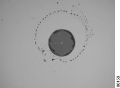 A figura mostra um conector duplex multimodo limpo. Observe que há uma quantidade pequena de sombreamento aceitável ao longo da borda do revestimento. Nota: Existe mais de uma fibra visível na ampliação de 200x. Núcleo não está iluminado.