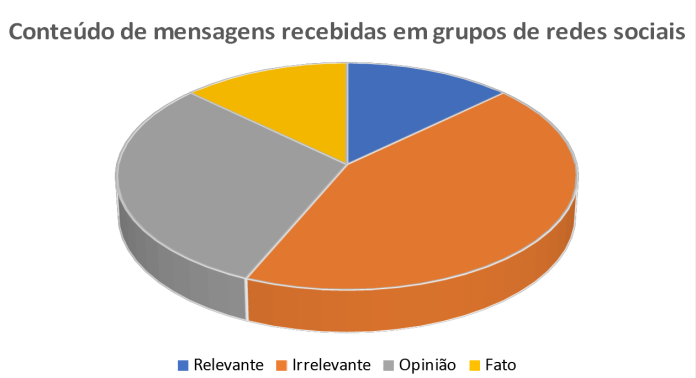 Neste contexto, tabulei em um gráfico o conteúdo das mensagens que costumo receber em grupos das redes sociais dos quais participo. Abaixo está o que encontrei. Proponha que você faça o mesmo. Possivelmente encontrará também uma quantidade maior de mensagens irrelevantes do que mensagens relevantes, bem como uma fatia maior de opiniões do que de fatos.