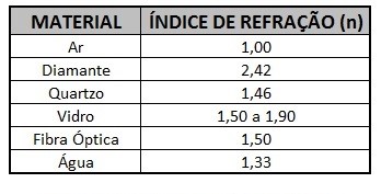 A mudança de direção do raio refratado significa dizer que a velocidade da luz neste meio é inferior, a qual é uma função do meio em que está inserida. Quanto mais denso for o meio, menor será a velocidade da luz refratada.