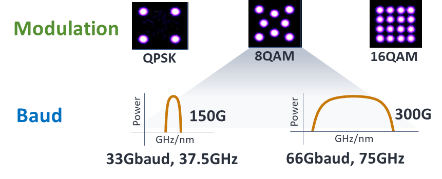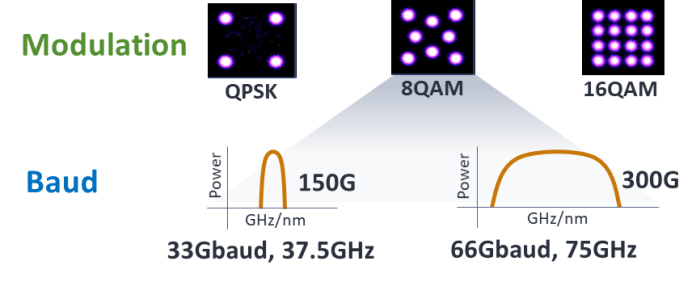 Modulação: A modulação das portadoras ópticas essencialmente determina quantos bits por caractere podem ser utilizados para transmitir informações. Quanto maior o número de bits, mais largura de banda poderá transmitir, doravante aumentando a eficiência espectral. No entanto, quanto mais densa a modulação, mais suscetível estará ao ruído do canal. Por esta razão, quanto mais densa for a modulação, menor será a distância do link que pode ser alcançado.