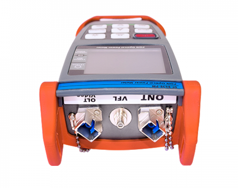 Exemplo das interfaces do Power Meter PON OT-8439-PM, que inclui um localizador de falhas (VFL ou Visual Fault Locator)
