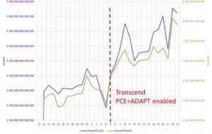 Usando simplesmente o congestionamento e o atraso como o critério de seleção do caminho, o operador pôde programar a rede para redirecionar os serviços assim que um nível de congestionamento específico fosse atingido. Ao fazer isso, foi capaz de eliminar a perda de quadros e balancear a rede automaticamente, sem qualquer interação humana. Como mostrado abaixo, a operadora conseguiu equilibrar de maneira mais equilibrada o tráfego e melhorar a utilização em até 30 a 60 pontos percentuais em algumas rotas.
