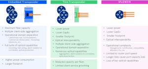 - Transponders Embarcados maximizam a capacidade: Integrados em plataformas ópticas, oferecem alta capacidade de fibra (até 1,2 Tb/s), múltiplas portas de cliente e funções ópticas avançadas, mas consomem mais energia e ocupam mais espaço. Também oferecem separação de domínios operacionais útil para interceptações legais e SLAs.