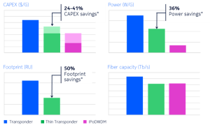 Para quantificar os benefícios dos thin transponders, foi realizada uma análise de rede em um enlace óptico de 1.000 km totalmente preenchido (Banda C), comparando lado a lado os três modelos de implantação. Em comparação com transponders embarcados, os thin transponders oferecem redução significativa em CapEx ($/G), consumo de energia (W/G) e ocupação de espaço (RU). No entanto, oferecem cerca de 20% menos capacidade por fibra.