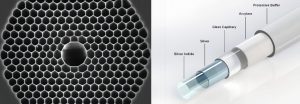 As fibras ópticas hollow-core (HFC), ou de núcleo oco, representam um salto conceitual na tecnologia de transmissão óptica. Ao invés de guiar a luz por meio de um núcleo sólido de sílica, como nas fibras convencionais, essas fibras conduzem os pulsos de luz por um núcleo preenchido com ar ou vácuo, utilizando estruturas fotônicas ao redor para manter o confinamento óptico por reflexão (Fig. 5). Esta tecnologia foi proposta pela primeira vez na década de 1960.